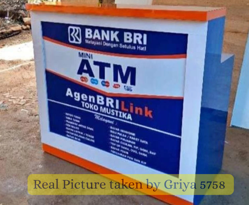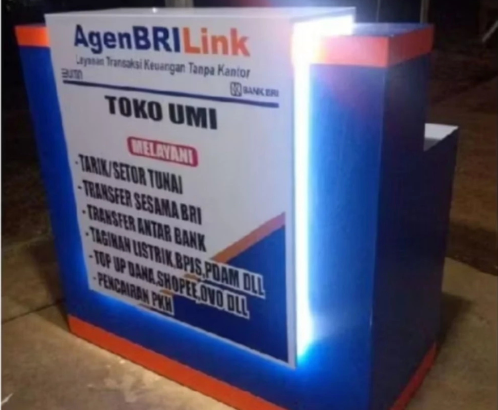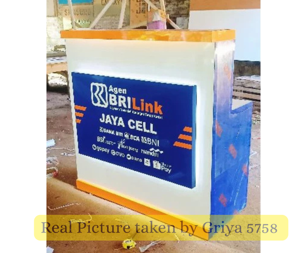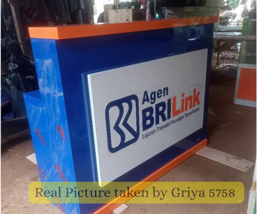 Meja kasir BRILink dengan desain custom tulisan untuk kebutuhan agen dan toko. Dibuat dari material kokoh, dilengkapi lampu dan colokan listrik sehingga langsung siap pakai.