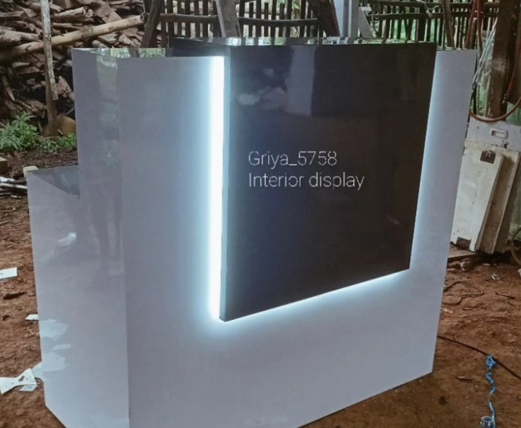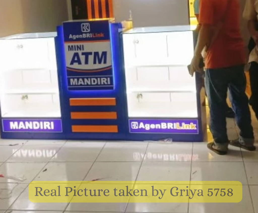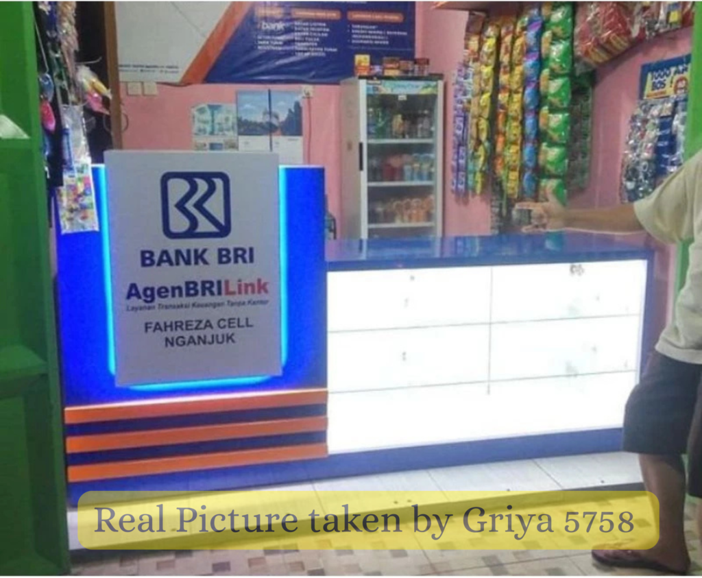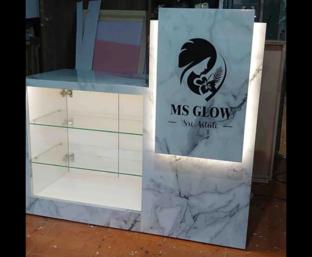 Meja kasir BRILink dengan desain custom tulisan untuk kebutuhan agen dan toko. Dibuat dari material kokoh, dilengkapi lampu dan colokan listrik sehingga langsung siap pakai.