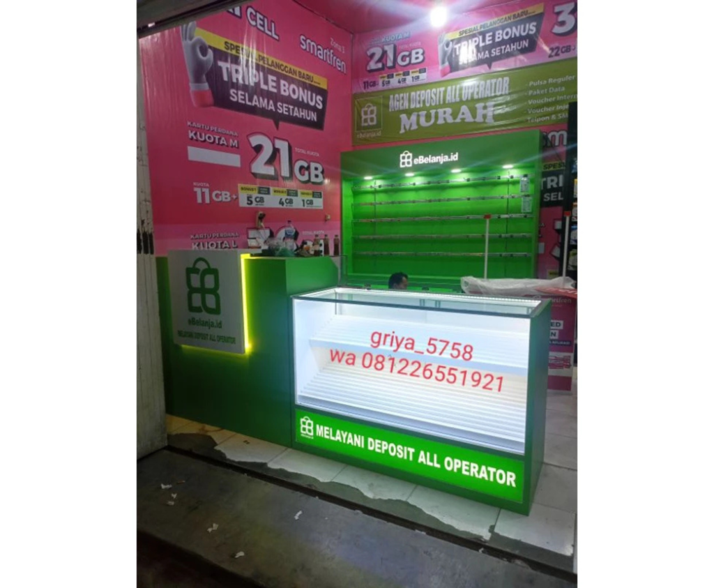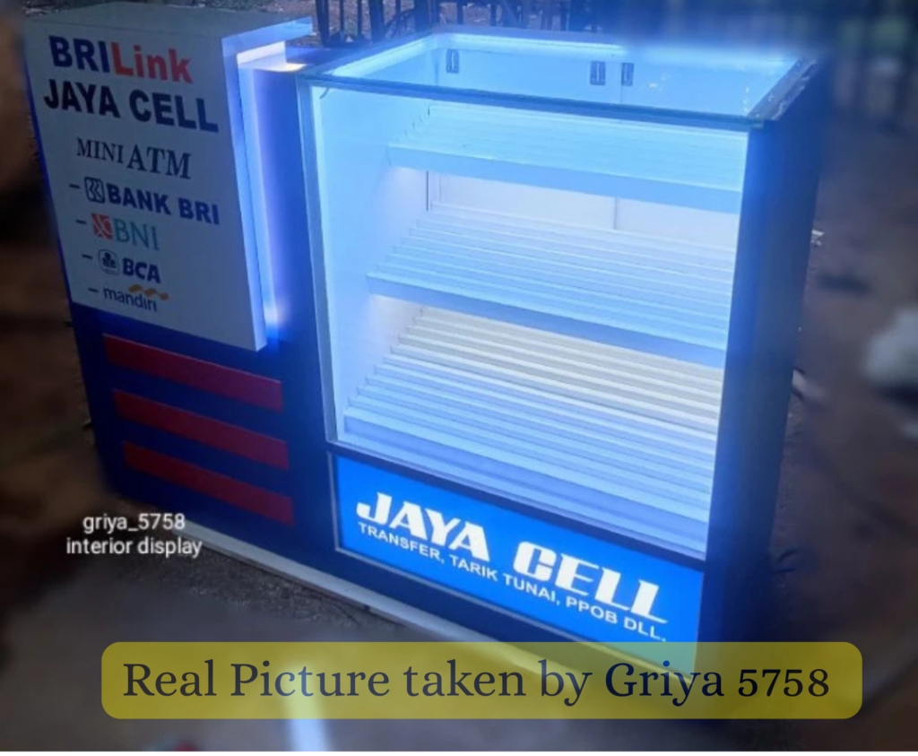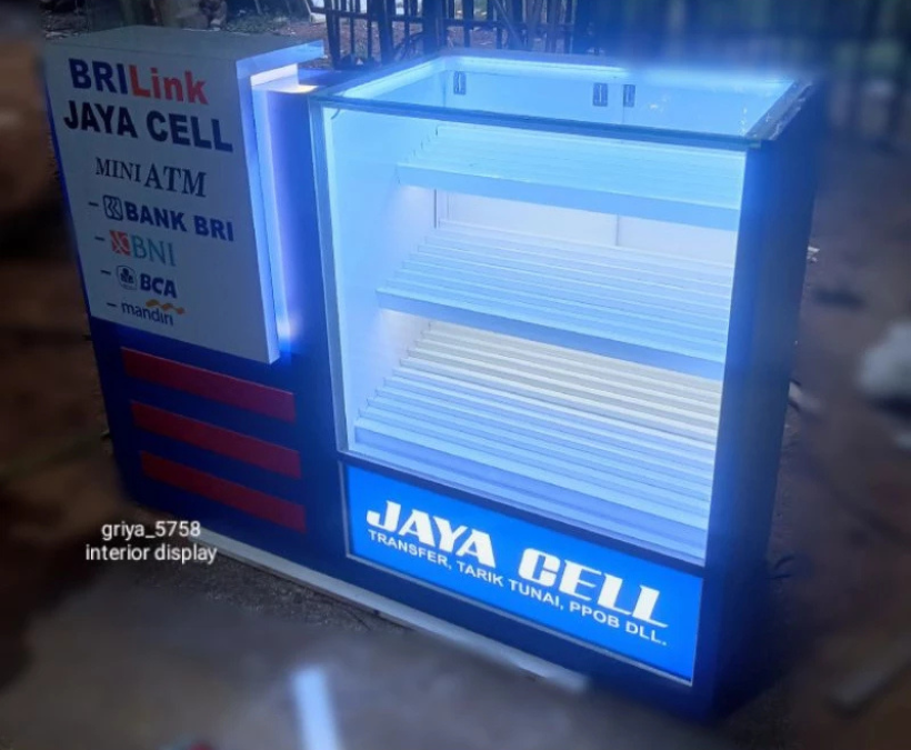 Etalase counter premium untuk agen BRILink dengan kombinasi display kaca dan branding lengkap. Produk dikirim dalam kondisi baru, sudah dilengkapi lampu dan colokan listrik, sehingga langsung siap operasional.